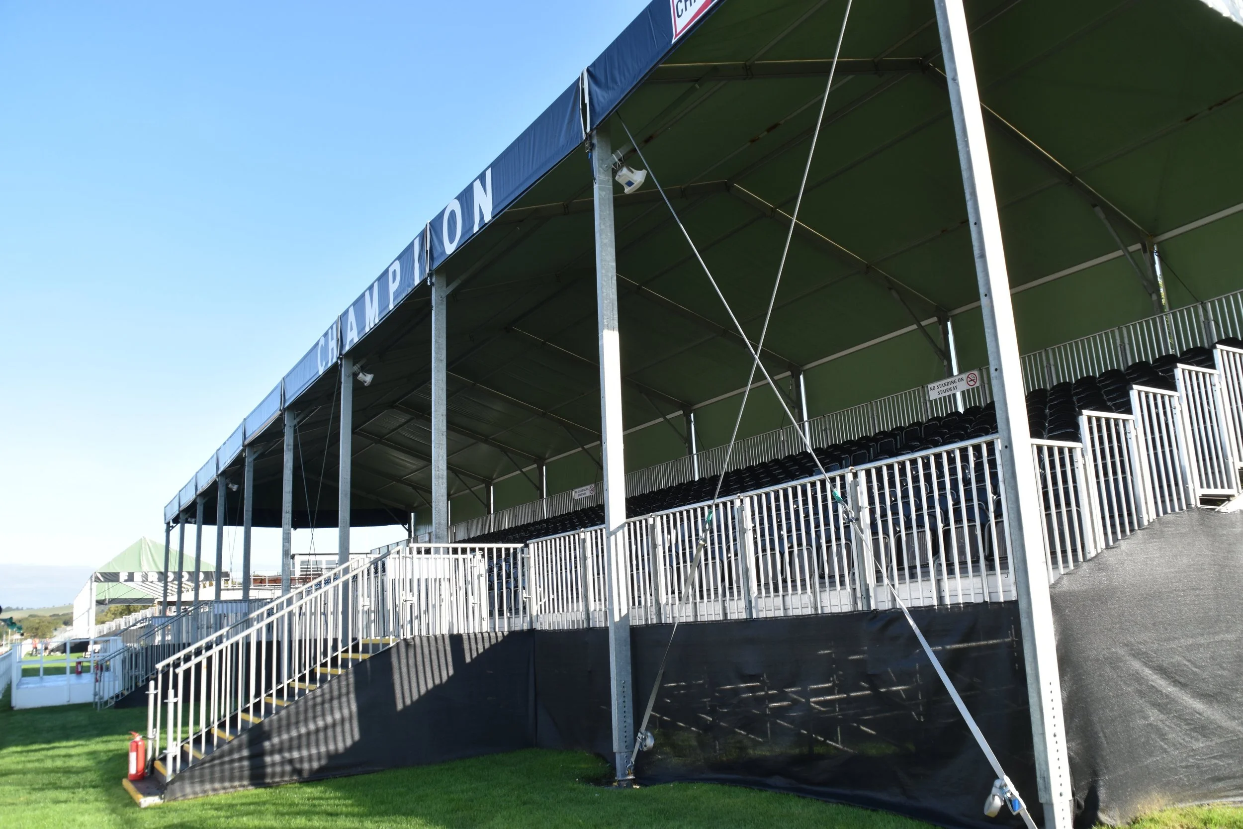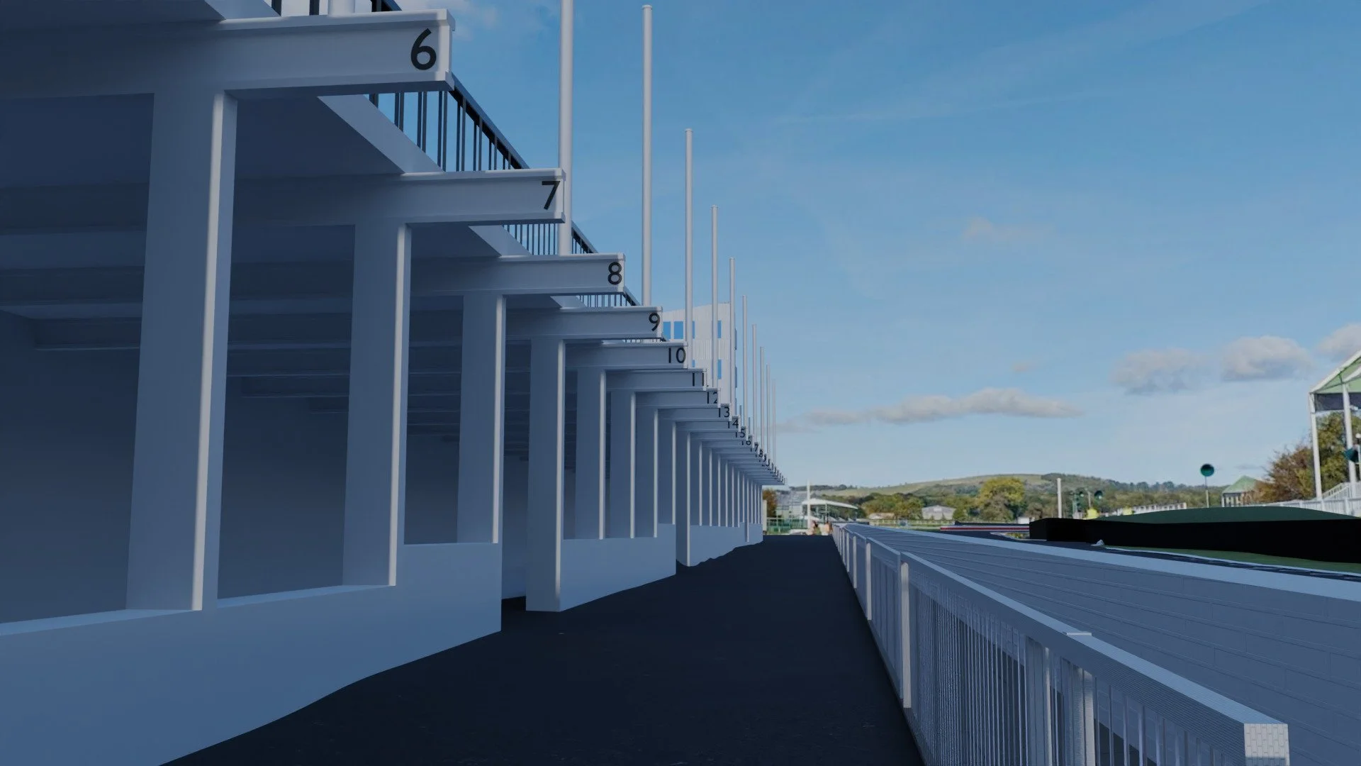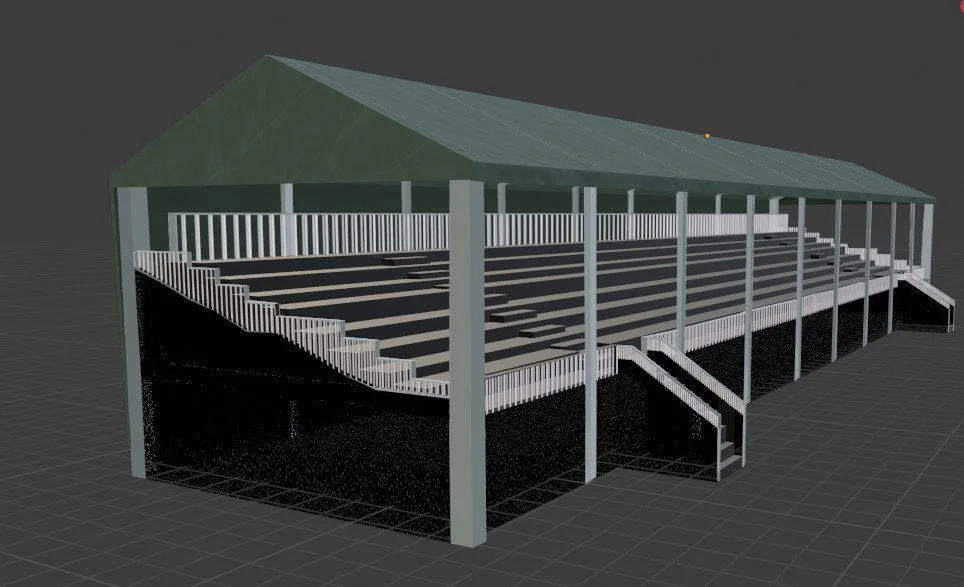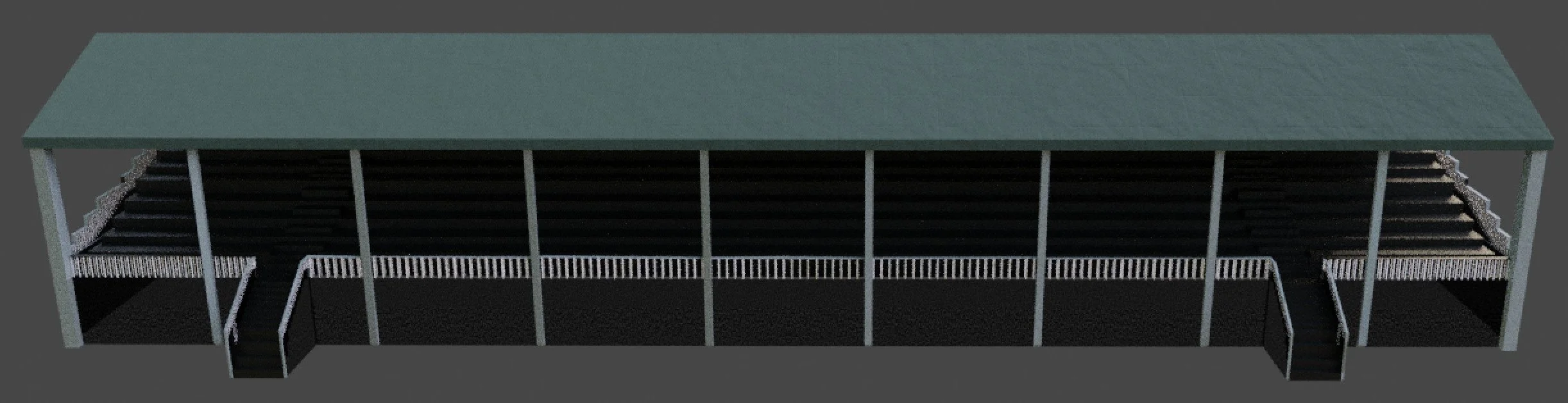This is the grandstand that I made for this project. I feel that this is a really good representation of the grandstands that are used by Goodwood in real life. They are temporary structures meaning that they are made out of materials that are easy to transport around. They have a canvas roof and are made of scaffolding material. I feel that I have been able to recreate this feel really well in the model that I made. When I was making the rails, I decided that to reduce the face count of the scene, I would use a texture. This texture was a metal link fence that I stretched using a Mapping node to make it straight. This was then painted white to give the look that I required.