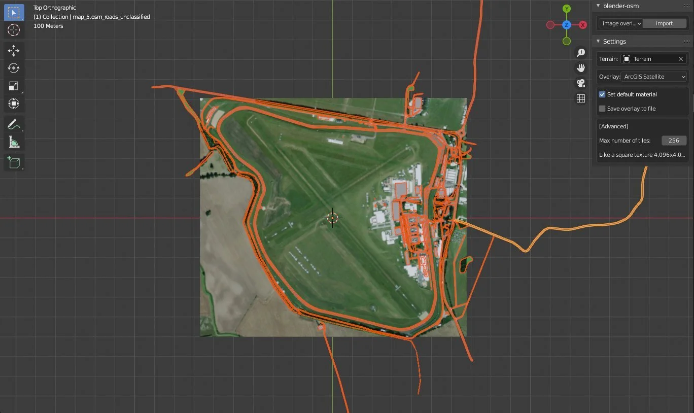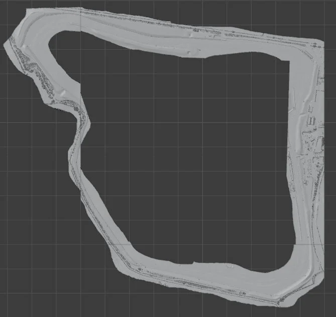There is an addon for Blender called OSM. This allows the user to select the area that they want to import and copy it into Blender. This will import everything from roads and vegetation to water and even some rudimentary buildings. This would provide an invaluable tool for me while working on this project. Not only did it provide me with a really good starting point for my project, but It also gave me an exact layout of the tack and a terrain object that was mapped to the real elevation of the track. Although it is not an as high resolution as the LiDar data, I found that I could combine the 2 pieces of data to make something that would look really realistic.