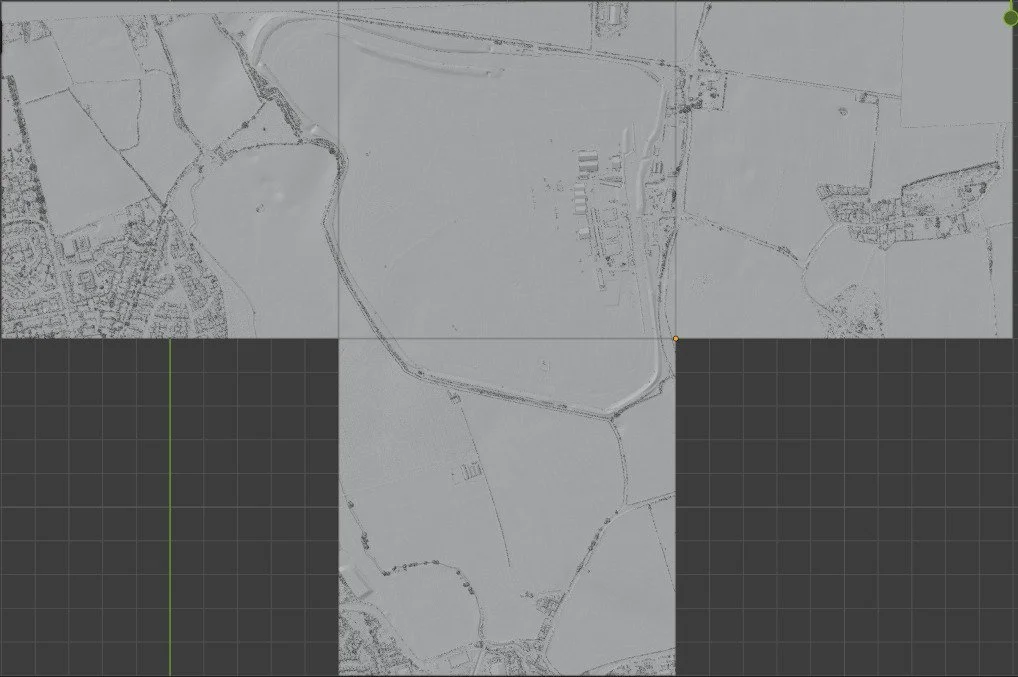 I started to scout around for a data set that i could use for this project. Since i wanted to make it look as realisitc as possible, I needed to find LiDar data that would match what I was looking for. LiDar stands for Light Detection and Ranging and is a system that allows someone to take exact mesurments using lasers. The UK Government does this using satalights and makes it freely available. The resolution I found was 50cm meaning that there was A mesurment beeing done every 50cm. I downloaded the area that I needed but then had to do some cleaning of the data since it was over 2,000,000 polygons. I removed all the parts that wouldnt be seen by the end user to make it so that my PC could run the scene. This was a really good start for me since it provided a lot of the information that I would need to make my scene.